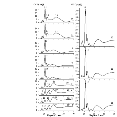 Изменение амплитуды колебаний в зависимости от широты проиллюстрировано на рис. 7. Годовая волна имеет амплитуду на экваторе ~ 5-10 ед.Д., затем в области широт 10-40° N она возрастают до 20 ед.Д. и на широтах > 50° N амплитуда годовой волны превышает экваториальную в 10-15 раз, поднимаясь выше 60 ед.Д. на ст. Тура. Более или менее равномерно растет с широтой амплитуда колебаний ОСО с периодом 16 мес. (1.3 года). Амплитуда квазидвухлетних колебаний ОСО (с периодом 29 мес.) уменьшается от экватора к Северному полюсу, а амплитуда колебаний с периодом 35 мес., наоборот, растет с широтой. При этом в области широт примерно 10-30° N наблюдаются минимальные значения амплитуд квазидвухлетних колебаний ОСО (в этой области широт образуется некий “ провал” в амплитудах КДК.