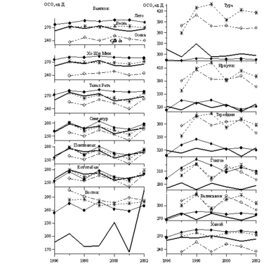 Временные вариации средних за сезон значений общего содержания озона представлены на рис.3. Можно видеть, что для всех экваториальных станций вплоть до широт Китая средние за зиму значения ОСО наиболее низкие во все годы в течение всего рассматриваемого периода с 1996 г. по 2002 г., а средние за лето значения ОСО - самые большие. Для станций, расположенных в области средних и приполярных широт, ситуация резко меняется: от ст. Валикьюэн в Китае до ст. Тура в России, а также на ст. Восток в Антарктике самыми низкими значениями за все рассматриваемые годы являются средние значения ОСО за лето и за осень (за исключением ст. Гонгхе в Китае).. Все среднесезонные значения на экваториальных станциях от Кототабана до Хо-Ши-Мина