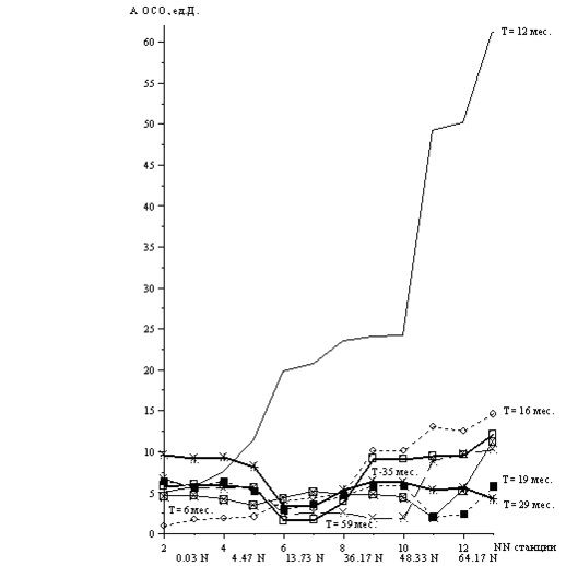 Изменение с широтой амплитуд крупномасштабных колебаний ОСО с периодами 6, 12, 16, 19, 29, 35 и 59 мес. по всем используемым в работе станциям можно оценить из таблицы 4. В нижней строке приведены рассчитанные для всей долготной зоны 100-110° в.д. средние по всем широтам значения амплитуд колебаний ОСО с указанными периодами. На первых 3-х станциях, расположенных на экваторе, наибольшую амплитуду имеют квазидвухлетние колебания с периодом 29 мес., но уже начиная с ~ 5° N (ст. Танах-Рата в Малайзии) превалирующей на амплитудных спектрах становится амплитуда годовой волны, которая стремительно растет с ростом широты в северном полушарии и на самых северных станциях становится более, чем в 2 раза, выше среднего значения годовой амплитуды в долготной зоне 100-110° в.д.
