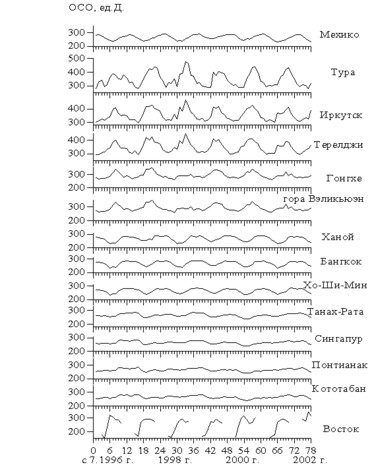 На рис.5 представлены временные вариации среднемесячных значений ОСО на 14 станциях. Во временных вариациях среднемесячных значений ОСО на 4-х экваториальных станциях (Кототабан, Понтианак, Сингапур и Танах-Рата) четко проявляются квазидвухлетние колебания. Для среднеширотных станций начинает превалировать годовая волна, амплитуда которой постепенно растет с ростом широты достигая максимальных значений на станции Тура (Россия) вблизи полярного круга.