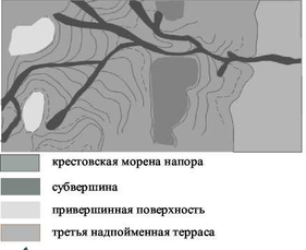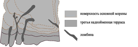 Рис. 4. Морена напора с привершинными поверхностями и субвершинами, с разветвленной ложбинно-лощинной сетью