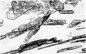 олластонит β-СаО∙5SiO2 и псевдоволластонит α-СаО-5SiO2— однокальциевые силикаты. Волластонит — природный минерал, образуется также при расстекловании некоторых технических стекол. Форма кристаллов игольчатая, брусковидная и волокнистая со спайностью, параллельной удлинению. Система моноклинная. Ng = 1,631, Nр = 1,616, Ng — Nр = 0,015. Оптический знак отрицательный. Погасание параллельно удлинению. Рис. 2. Псевдоволластонит в стекле (74 X) Удельный вес 2,915. В воде не разлагается, в кислотах легко растворяется.
