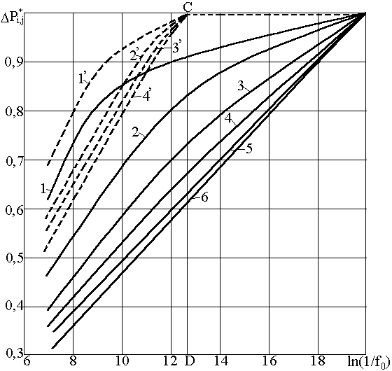 Анализ зависимости поведения депрессии p*i,j от f0 для всех rc >0,01 показывает, что графики этой зависимости можно описать уравнением пучка прямых для любого значения h. Для rc< 0,01 в графиках зависимости появляются начальные нелинейные участки, переходящие при дальнейшем уменьшении параметра f0 (или же при увеличении его обратной величины 1/foj) в прямые для всех значений h (рис. 2). При h=l,0 поведение депрессии строго линейно. Кроме того, протяженность нелинейного участка для разных rc при h=const различна. И чем меньше значение безразмерного радиуса rc , тем больше протяженность нелинейного участка (рис. 2). 2. Определим поведение R(rc, h, f0) и ее зависимость от безразмерных параметров rc, h, f0. Значения R(rc, h, f0) рассчитаны для тех же величин параметров rc, h, f0. которые указаны в пункте 1, обработка результатов также аналогична. Переход от безразмерной функции сопротивления R(rc, h, f0) к относительной R*i,j (rc) осуществлен согласно выражению Анализ поведения R*i,j (rc) и результаты обработки расчетного материала, где установлена ее зависимость от параметров rc, h, f0, частично приведены на рис, 2 (кривые даны пунктиром). При гc >0,01 для любого hi R*i,j (rc) уже не зависит от f0i . Из анализа данных расчета и графиков рис. 2 следует: при rc<0,01 в поведении R*i,j (rc) для всех h что для одного и того же значения rc абсцисса точки перехода нелинейного участка в линейный для R*i,j (rc) имеет то же самое значение, что и абсцисса точек перехода для графиков зависимости p*i,j (rc) от ln(l/f0i ) (линия CD). Начиная с этого момента, R*i,j (rc) для данного rc при дальнейшем наблюдении зависит не от времени, а только от hi • И чем выше степень вскрытия, т. е. чем совершеннее скважина,. тем меньше будет значение R*i,j (rc) И при h=l (скважина совершенная по степени вскрытия) функция сопротивления равна нулю. Очевидно, нелинейность p*i,j (rc) связана с характером поведения функции сопротивления, которая, в свою очередь, зависит от параметра Фурье. Отметим также, что в точке С (рис. 2) численное значение функции сопротивления становится равным значению фильтрационных сопротивлений (C1(rc, h)) для притока установившегося режима. Рис. 2. Поведение относительной депрессии и относительной функции фильтрационного сопротивления (rc=0,0014, h=const, f0) при h, равных: 1,1'—0,1; 2,2'— 0,3; 3,3'—0,5; 4,4'—0,7; 5,5'— 0,9; 6,6'— 1,0. выводы 1. Депрессия на забое несовершенной по степени вскрытия скважины для всех rc < 0,01 имеет два явно выраженных закона изменения: а) нелинейный, который обусловлен зависимостью функции сопротивления от времени и соответствует неустановившемуся притоку сжимаемой жидкости (газа); б) линейный, который соответствует квазиустановившемуся притоку и не связан с функцией сопротивления. 2. Величина R(rc, h, f0) для неустановившегося притока качественно описывает С1(rc, h) для установившегося, и ее численное значение при любом вскрытии пласта всегда меньше численного значения С1(rc, h) при установившемся притоке. 3. Полученное аналитическое решение для неустановившегося притока сжимаемой жидкости (газа) к несовершенной скважине в бесконечном по протяженности пласте преобразовано в прямолинейную анаморфозу, которая позволяет эффективно интерпретировать кривые восстановления забойного давления. 4. Выбор fo, дающего значения p*i,j(rc)=1, не влияет на протяженность нелинейного участка, соответствующего неустановившемуся движению, на графики зависимости p*i,j(rc) от ln(1/f0i). ЛИТЕРАТУРА 1. 