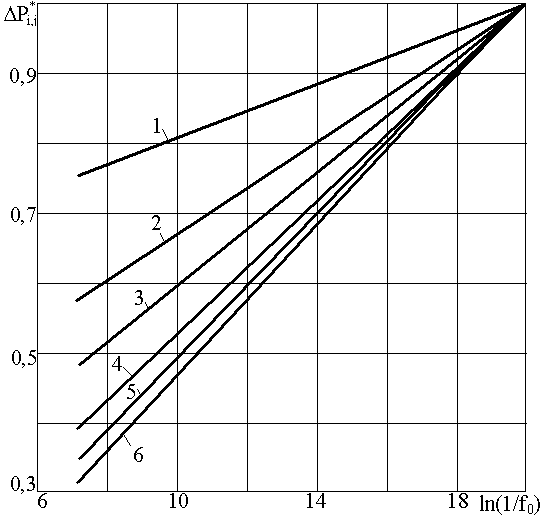 Рис. 1. Поведение относительной депрессии (rc=0,0200, hi=const, f0) при значениях h, равных: 1— 0,1; 2 — 0,3; 3—0,5; 4 — 0.7; 5 —0,9; 6—1,0.