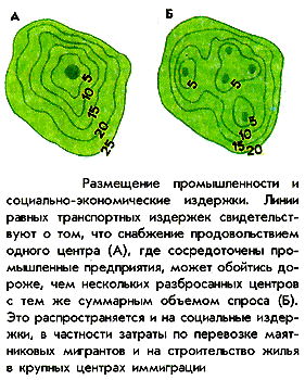 Сравнение транспортных издержек показало, что снабжение продовольствием одного центра, где сосредоточены все промышленные предприятия, обходится намного дороже, чем нескольких разбросанных центров с тем же объемом спроса. Таким образом, при высоких издержках на транспортировку, наиболее оптимальным будет децентрализация промышленного производства по многим мелким центрам. Сосредоточение промышленности в небольшом числе крупных центров будет оптимальным вариантом размещения лишь при высоких транспортных издержках на перевозку продукции специализированных отраслей.