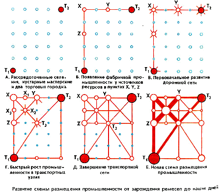Работы над общей теорией размещения промышленности и разработкой моделей, позволяющих учесть все эти факторы (или их большую часть), начались в конце XVIII в. Первые модели размещения были созданы экономистами рикардианской школы (Смит, Рикардо), которые считали размещение промышленности результатом пространственного распределения излишков сельскохозяйственной продукции, необходимых как продовольствие для рабочих и сырье для производства. Экономист Лориа (1898 г.) считал, что трудоемкие отрасли промышленности должны быть приурочены к сельскохозяйственным районам с высокой плотностью населения, которое, в свою очередь, должно быть достаточно бедным и нуждаться в дополнительном доходе.