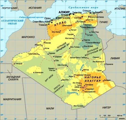 Столица Алжирской Народной демократической Республики – Алжир. Население – 32,82 млн. человек (2003). Плотность населения – 12 человек на 1 кв. км. Городское население составляет 56%, сельское – 44%. Площадь – 2381,74 тыс. кв. км. Самая высокая точка – гора Тахат (2908 м), самая низкая озеро Мельгир (-40 м). Основные языки: арабский (государственный), французский. Государственная религия – ислам. Административно-территориальное деление: 48 вилай (провинций). Денежная единица: динар = 100 сантимам. Национальный праздник: Годовщина революции – 1 ноября. Государственный гимн: «Мы клянемся...»