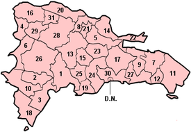 Национальный округ - столица Санто Доминго, 29 провинций (Azua, Baoruco, Barahona, Dajabon, Duarte, Elias Pina, El Seibo, Espaiallat, Hato Mayor, Independencia, La Altagracia, La Romana, La Vega, Maria Trinidad Sanchez, Monsenor Nouel, Monte Cristi, Monte Plata, Pedernales, peravia, Puerto Plata, Salcedo, Samana, Sanchez Ramirez, San Cristobal, SanPedro de Macoris , Santiago, Santiago Rodriguez, Valverde Mao).