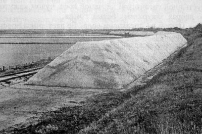 Рис. 91. Бурты самосадочной поваренной соли соседствуют с испарительными бассейнами Генического озера.