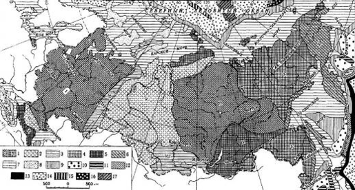 На рис. 7: Морфоструктуры суши, дна океанов и морей. Суша — 1 — равнины, плато (а) и возрожденные горы (б) древних платформ (I — Восточно-Европейская (Русская) равнина, II — Кольско-Карельская страна, III — Среднесибирское плоскогорье, IV — Байкальская горная страна); 2 — равнины молодых платформ (V — Западно-Сибирская равнина, VI — Предкавказье); 3 — возрожденные горы области палеозойской складчатости (VII — Урал, Новая Земля, VIII — Алтайско-Саянская горная страна); 4 — омоложенные горы области мезозойской складчатости (IX — горная страна Северо-Востока, X — Амурско-Приморско-Сахалинская страна); 5 — молодые горы области альпийской складчатости (XI — Кавказ); 6 — молодые горы области кайнозойской (тихоокеанской) складчатости (XII — Корякско-Камчатско-Курильская страна, XIII — Охотско-Приморский вулканический пояс). Дно океанов и морей. Материковый шельф — 7 — равнины окраины материка; 8 — равнины на внутришельфовых впадинах, переходная зона (материковые склоны и островные дуги); 9 — наклонные равнины — уступы; 10 — равнины дна котловин; 11 — складчато-глыбовые хребты и массивы, 12 — складчато-глыбовые и вулканические хребты островных дуг, 13 — глубоководные желоба. Ложе океанов и морей — 14 — равнина дна глубоководных котловин, 15 — срединно-океанические хребты, 16 — вал и возвышенности, 17 — складчато-глыбовые хребты