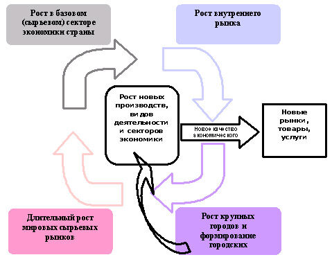 Однако сегодняшний интерес к концепции городской агломерации связан с тем, что экспертами зафиксированы принципиально новые процессы развития крупных городских систем. Они напрямую связаны с вызовами, с которыми сталкивается бурно развивающаяся и обновляющаяся экономика России. Эти вызовы кратко характеризует укрупненное представление о механизмах роста экономики нашей страны в средне- и долгосрочной перспективе (см. рис. 1):