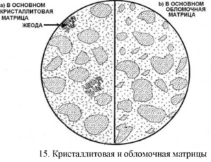 7.Природа матрицы: кристаллитовая, обломочная, или изверженная. Минералогия матрицы и наличие открытых пор (рис.15). Брекчия с обломочной матрицей будет иметь плохую сортировку обломков, за исключением особого случая с тонкозернистой глинкой трения.
