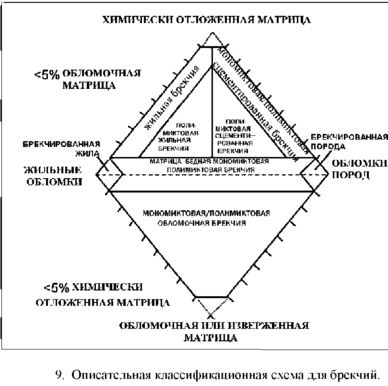 Стандартных схем классификации брекчий, подобные таким, которые существуют для осадочных, изверженных и метаморфических пород не имеется. По-видимому, большинство исчерпывающих описательных критериев для брекчий, приведённых Laznicka (1988), охватывают каждый из возможных типов брекчий (включая внеземные и антропологические типы). Здесь используется простая описательная классификационная схема, которая может применяться к большинству брекчий, найденных во время рудной разведки в эпитермальных и порфировых условиях. Они представлены на рис.9.