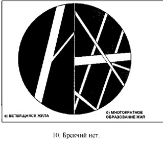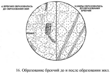 8.Временные соотношения брекчирования и образования жил (если жилы присутствуют). Представлены ли жилы в виде обломочных жил и/или жил с иным составом обломков, указывающим на то, что они образовались до брекчирования или жилы секут брекчию (рис. 16)?