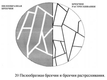 Брекчия растрескивания (рис.20): тип брекчий, которые были раздроблены, но с небольшим количеством матричного материала или без него. Обломки не смещены. Иногда они назывались брекчией гидравлического дробления, но предпочтительнее применяется негенетический термин «брекчия растрескивания».