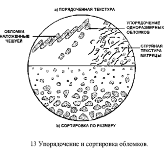 Размещение обломков упорядоченное, чешуйчатое или отсортированное и проявляются ли в матрице текстуры типа «структур течения» (рис.13).