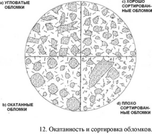 Форма обломков угловатая или окатанная (рис.12)? Для этих и других двух следующих параметров может быть использована стандартная седиментологическая терминология.