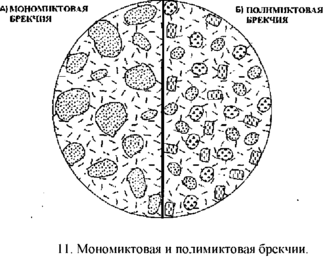 Обломочная литология - является ли состав обломков однородным, или обломки представлены многими литологическими разностями (мономиктовые или полимиктовые) (рис.11). Если обломки разнообразные по литологии, то какую стратиграфическую информацию можно получить по ним? Принесены ли породы, слагающие брекчии, из одного или многих стратиграфических источников и представляют ли стратиграфические позиции обломков выше или ниже лежащие формации по отношению к современному положению брекчий?