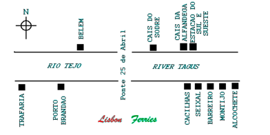 Лиссабон расположен на реке Тежу (Рио-Тежу), около 10 км от ее впадения в Атлантический океан. Реки около 2 км широкий напротив центра города и его глубина достигает максимум 41 метра примерно две трети пути через дорогу от Лиссабона до Касильяш. На протяжении многих лет была очень интенсивной службы обычные паромы на полдюжины Направления на южном берегу. Тем не менее, с открытием железнодорожной линии Fertagus и новые Васко да Гама автодорожного моста, услуги были снижены, но тем не менее остаются частыми, чтобы Касильяш, Баррейру, Seixal и Montijo. Все чаще катамараны используются в более дальних направлениях на 'Outra банда', южной стороне реки. Были пять терминалов пароме (estações fluviais) на стороне Лиссабонской Тахо, хотя первые два упомянутых ниже, Estação E-ду-Сул и Sueste Cais да Alfândega были пристроены и эффективно одном сайте.