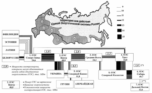 Примечание. Значком (*) отмечено наличие системной связи между ОЭС Урал и Сибирь только через территорию ОЭС «Северный Казахстан»; знак (**) подчеркивает наличие связи между ОЭС Сибирь и Дальний Восток только за счет двух отпаечных ЛЭП–220 кВ.