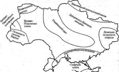 Територія України характеризується різноманітністю своєї геологічної будови, формуванням протягом тривалого часу своїх складових частин. Розміщується Україна в зоні зчленування Східноєвропейської платформи і складчастих споруд Середземноморського поясу, які включають Карпати і Крим. Серед головних її структурних елементів треба назвати Український щит, складчасті споруди Донбасу, Криму і Карпат, Дніпровсько-Донецьку западину, Волино-Подільську плиту. Вони мають різну геологічну будову й історію розвитку (див. рисунок).