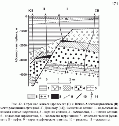 В Припятском прогибе открыто 64 месторождения нефти. Их поиски и разведка осуществлялись с 1952 г., разработка —с 1965 г. На этих месторождениях — 185 залежей нефти, из них 183 — в девонских отложениях и 2 — в верхнепротерозойских. Наибольшее количество нефтяных залежей (95) приурочено к подсолевой карбонатной толще; в межсолевой толще их 64, в верхней солевой — 13, в подсолевой тер-ригенной —11. Кроме того, выявлены залежи газоконденсата и газа на Красносельском месторождении. Все месторождения, за исключением одного, расположены в северной тектонической зоне Припятского бассейна. На рис. 42 для примера дан геологический разрез двух месторождений нефти.