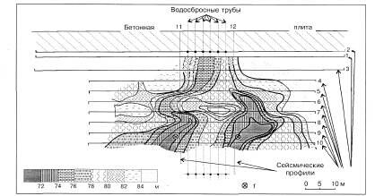 Модель Шипуновского водохранилища имеет пя-тислойное строение (рис. 2). Рельеф поверхности коренных пород в пределах насыпной плотины изменяется от отметок 72 м до 84 м (рис. 3). Пониженные отметки рельефа локализуются в две достаточно узкие извилистые зоны, из которых западная может быть отождествлена с захороненным руслом р. Холодная. Сейс-мотомографические разрезы, полученные по параметру у, показали, что с увеличением глубины значения у постепенно уменьшаются до 0,25, которые свойственны полностью водонасыщенным грунтам. Наблюдаемая аномалия отношения у = 0,25 совпадает с захороненным руслом. В пределах низового откоса плотины выделяется ряд локальных зон с распространением рыхлых разуплотненных грунтов (V < 200 м/с), среди которых наиболее значительной является зона над водосбросными трубами по профилям 5-9. Именно на этом участке (между 8 и 9 профилями) фиксируются провалы. Таким образом, на этом участке фиксируется и древнее русло р. Холодная, и локальное понижение уровня грунтовых вод. Совпадение в плане просадки плотины и провалов грунта с захороненным руслом логично объяснить повышенной фильтрацией (стоком) воды в пределах этого канала. При этом идет процесс интенсивного вымывания частиц, и в первую очередь мелких фракций, в результате которого и появляются наблюдаемые провалы грунта на поверхности земляной насыпи. В целом потенциально опасным участком в отношении возможного прорыва Шипуновской плотины является зона повышенной фильтрации грунтовых вод в верхней части водонасышенных грунтов, которая в основном контролируется захороненным руслом р. Холодная.
