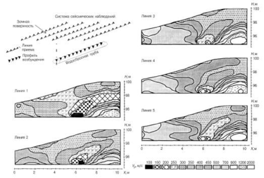Полевые работы были выполнены по методике многокрагных наблюдений с использованием продольных и поперечных профилей. Расстояния между пунктами возбуждения упругих колебаний составляли до 1 м, такие же расстояния были и между пунктами приема упругих колебаний. На Шипуновском водохранилище сейсмические наблюдения выполнены по системе профилей, проложенных в средней части дамбы: десять профилей располагались параллельно оси дамбы на расстоянии друг от друга примерно 4 м, два профиля -поперек дамбы на расстоянии 1,5 м от крайних водосбросных труб. Система сейсмических профилей на Карасевском водохранилище также располагалась в средней части дамбы: четыре продольных профиля - параллельно оси дамбы на расстоянии друг от друга примерно 10 м, шесть поперечных профилей - поперек дамбы на расстоянии примерно 6 м друг от друга.
