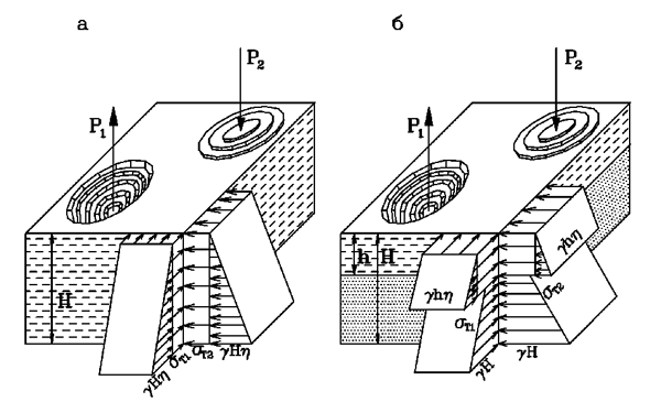 В качестве факторов техногенного воздействия человека на земную кору выступают либо перемещения масс горных пород - выемка из карьеров и подземных разработок и складирование вскрышных пород и отходов обогащения в отвалы, либо нарушение гидрогеологического режима в связи с откачкой подземных вод. Источником формирования наведенных геомеханических процессов является нарушение первоначального равновесия в напряженном состоянии верхней части земной коры в результате добычи полезного ископаемого [2]. Вторичное поле напряжений формируется за счет образования выемок и пустот в горном массиве и за счет изостазического нарушения равновесия вследствие перемещения больших объемов горных пород, особенно при открытых разработках. При добыче твердых полезных ископаемых сопутствующими факторами выступают откачки подземных вод, образование депрессионных воронок. При добыче нефти и газа, массовых откачках подземных вод эти факторы могут оказаться ведущими.