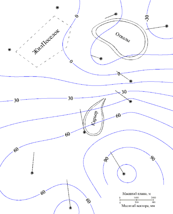 Рис. 2. Вектора горизонтальных сдвижений и изолинии вертикальных смещений пунктов геодезической сети