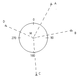 Измерение направлений способом круговых приемов. Для измерения направлений из точки М на пункты A, B, C, D в т. М устанавливают теодолит, алидаду скрепляют с лимбом на отсчете 1-2’ и поворотом лимба направляют трубу на т. А.