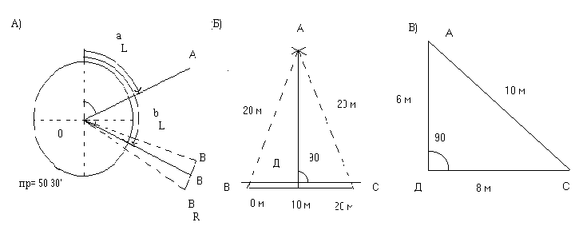 При строительстве часто возникает необходимость в построении прямого угла с небольшими сторонами и несколькими требованиями к точности построения. Для этих целей используют рулетку. При построении (рис 1 б) рулетку укладывают в створ линии ВС, совмещают штрих 10 м с вершиной угла Д и по штрихам 0 и 20 м отмечают положение точек В и С. Раствором рулетки 20 м из этих точек делают засечки и получают положение точки А.