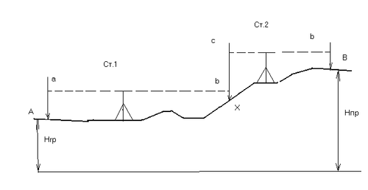 Если разность отметок точек НА и НВ большая и с общей установки вынести проектную отметку нельзя, то производят вынос с двух или более станций. Последовательность действий в этом случае видна из рис.2.