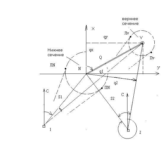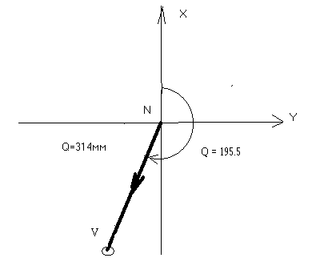 Пусть точка N – центр нижнего сечения сооружения, точка V – центр верхнего, контролируемого сечения (рис. 13). Требуется определить отклонение Q=NV и азимут отклонения Q. Отклонения вызванные наклоном фундамента, называют креном.