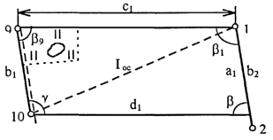 3.1.3.3 Для контроля вычислить площадь участка I поля, включающего пашню и сенокос с прудом, по сумме площадей двух треугольников в соответствии с рисунком 11. Расхождения с проектной площадью участка не должно превышать 0,02 га.