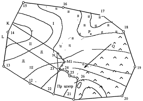 Разделить массив пашни в северной части землепользования на участки в соответствии с рисунком 12, при этом границы между ними провести карандашом (линии NK и 23 - L параллельны линии 13 - 12), обозначить номера контуров. Вкрапленные контуры обозначить тем же номером, что и основной контур с добавлением индекса “а”, “б” и т.д.