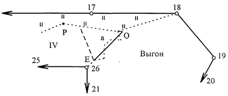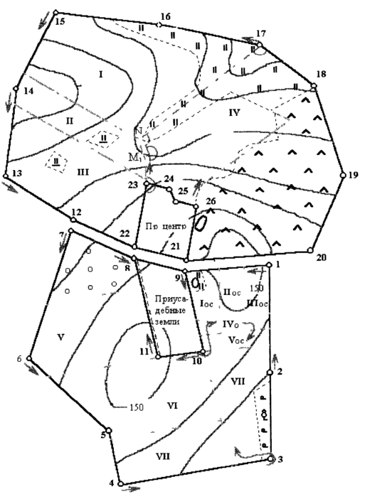 Угломерный способ применить для перенесения в натуру точек N и M1 по границам полей II и VI северной части землепользования, а границы остальных полей перенести в натуру способом промеров.