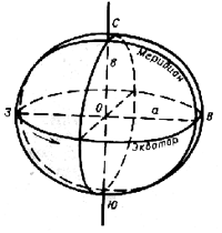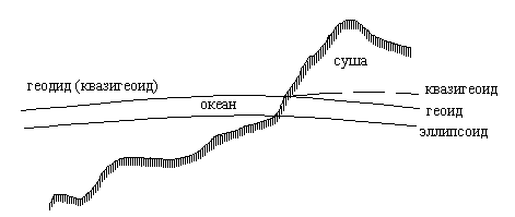 Первые представления о формах и размерах Земли появились еще в глубокой древности. Античные мыслители (Пифагор - V в. до н.э., Аристотель - III в. до н.э. и др.) высказывали мысль, что наша планета имеет шарообразную форму. Геодезические и астрономические исследования последующих столетий дали возможность судить о действительной форме Земли и ее размерах. Известно, что формирование Земли происходило под действием двух сил - силы взаимного притяжения частиц ее массы и центробежной силы, обусловленной вращением планеты вокруг своей оси. Равнодействующей обеих названных сил является сила тяжести, выражаемая в ускорении, которое приобретает каждое тело, находящееся у поверхности Земли. На рубеже XVII и XVIII вв. впервые Ньютон теоретически обосновал положение о том, что под воздействием силы тяжести Земля должна иметь сжатие в направлении оси вращения и, следовательно, ее форма представляет эллипсоид вращения, или сфероид. Степень сжатия зависит от угловой скорости вращения. Чем быстрее вращается тело, тем больше оно сплющивается у полюсов. На рис. 1.1, изображающем эллипсоид вращения, выражена большая экваториальная ось (ЗОВ) и малая полярная ось (СОЮ). Величины а = ЗОВ/2 и в = СОЮ/2 соответствуют полуосям эллипсоида. Сжатие эллипсоида будет выражено (а - в)/а. Разница полярного и экваториального радиусов составляет 21 км. Детальными последующими измерениями, особенно новыми методами исследования с искусственных спутников, было показано, что Земля сжата не только на полюсах, но также несколько и по экватору (наибольший и наименьший радиусы по экватору отличаются на 210 м), т.е. Земля является не двухосным, а трехосным эллипсоидом. Кроме того, расчетами Т. Д. Жонгловича и С. И. Тропининой показана несимметричность Земли по отношению к экватору: южный полюс расположен ближе к экватору, чем северный.В связи с расчленением рельефа (наличием высоких гор и глубоких впадин) действительная форма Земли является более сложной, чем трехосный эллипсоид. Наиболее высокая точка на Земле - гора Джомолунгма в Гималаях - достигает высоты 8848м. Наибольшая глубина 11 034 м обнаружена в Марианской впадине. Таким образом, наибольшая амплитуда рельефа земной поверхности составляет немногим менее 20 км. Учитывая эти особенности, немецкий физик Листинг в 1873 г. фигуру Земли назвал геоидом, что дословно обозначает "землеподобный". Геоид - некоторая воображаемая уровенная поверхность, которая определяется тем, что направление силы тяжести к ней всюду перпендикулярно. Эта поверхность совпадает с уровнем воды в Мировом океане, который мысленно проводится под континентами. Это та поверхность, от которой производится отсчет высот рельефа. Поверхность геоида приближается к поверхности трехосного эллипсоида, отклоняясь от него местами на величину 100 - 150 м (повышаясь на материках и понижаясь на океанах, рис. 1.2.), что, по-видимому, связано с плотностными неоднородностями масс в Земле и появляющимися из-за этого аномалиями силы тяжести. В настоящее время принимается эллипсоид Ф. Н. Красовского и его учеников (А. А. Изотова и др.), основные параметры которого подтверждаются современными исследованиями и с орбитальных станций. По этим данным экваториальный радиус равен 6378,245 км, полярный радиус - 6356,863 км, полярное сжатие- 1/298,25. Объем Земли составляет 1,083 • 1012 км3, а масса - 6 • 1027 г. Ускорени