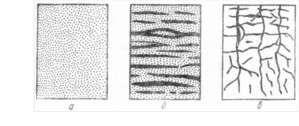 а- слитная(массивная); б-слоистая; в-ячеистая.