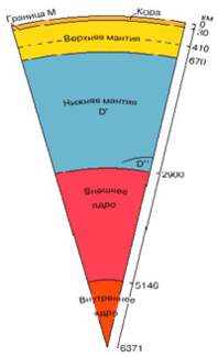 Но в середине XX века в науку вошли представления о более дробном глубинном строении Земли. На основании новых сейсмологических данных оказалось возможным разделить ядро на внутреннее и внешнее, а мантию - на нижнюю и верхнюю (рис. 1). Эта модель, получившая широкое распространение, используется и в настоящее время. Начало ей положил австралийский сейсмолог К.Е. Буллен, предложивший в начале 40-х годов схему разделения Земли на зоны, которые обозначил буквами: А - земная кора, В - зона в интервале глубин 33-413 км, С - зона 413-984 км, D - зона 984-2898 км, Д - 2898-4982 км, F - 4982-5121 км, G - 5121-6371 км (центр Земли). Эти зоны отличаются сейсмическими характеристиками. Позднее зону D он разделил на зоны D' (984-2700 км) и D" (2700-2900 км). В настоящее время эта схема значительно видоизменена и лишь слой D" широко используется в литературе. Его главная характеристика - уменьшение градиентов сейсмических скоростей по сравнению с вышележащей областью мантии.