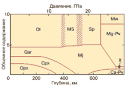 Согласно современным взглядам, в составе мантии преобладает сравнительно небольшая группа химических элементов: Si, Mg, Fe, Al, Ca и О. Предлагаемые модели состава геосфер в первую очередь основываются на различии соотношений указанных элементов (вариации Mg/(Mg + Fe) = 0,8-0,9; (Mg + Fe)/Si = 1,2Р1,9), а также на различиях в содержании Al и некоторых других более редких для глубинных пород элементов. В соответствии с химическим и минералогическим составом эти модели получили свои названия: пиролитовая (главные минералы - оливин, пироксены и гранат в отношении 4 : 2 : 1), пиклогитовая (главные минералы - пироксен и гранат, а доля оливина снижается до 40%) и эклогитовая, в которой наряду с характерной для эклогитов пироксен-гранатовой ассоциацией присутствуют и некоторые более редкие минералы, в частности Al-содержащий кианит Al2SiO5 (до 10 вес. %). Однако все эти петрологические модели относятся прежде всего к породам верхней мантии, простирающейся до глубин ~670 км. В отношении валового состава более глубоких геосфер лишь допускается, что отношение оксидов двухвалентных элементов (МО) к кремнезему (МО/SiO2) ~ 2, оказываясь ближе к оливину (Mg, Fe)2SiO4, чем к пироксену (Mg, Fe)SiO3, а среди минералов преобладают перовскитовые фазы (Mg, Fe)SiO3 с различными структурными искажениями, магнезиовюстит (Mg, Fe)O со структурой типа NaCl и некоторые другие фазы в значительно меньших количествах.