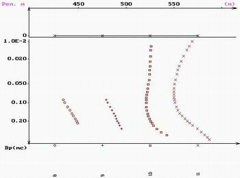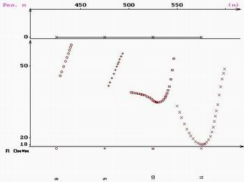 В качестве примера, демонстрирующего возможности МПП по выявлению трещинно-карстовых водонасыщенных зон, приведен интервал профиля с одной из наиболее ярких аномалий. Этот интервал соответствует переходу низкоомной (~ 150 Омм) толщи сланцев (слева) к высокоомным (более 1000 Омм) отложениям известняков (справа). На рис. 3 приведён геоэлектрический разрез этого интервала. Отрезки экспериментальных кривых в точках, по которым программой был построен данный разрез, приведены на рис.4 и 5. Это одни и те же кривые, но в разных представлениях - в вертикальном и в горизонтальном. В последнем случае можно более рельефно увидеть аномальное понижение сопротивления в районе пикета 550 м, где и была заложена скважина с очень хорошим дебитом. А водовмещающими, как показало бурение, оказались трещины и карстовые пустоты в известняках заполненные глиной.