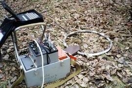 Предусмотренный проектом комплекс наземной геофизики кроме ВЭЗ включал сейсморазведку МПВ. Случилось так, что ко времени проведения этих работ, у предприятия не оказалось в наличии сейсморазведочной аппаратуры. Поэтому решено было направить средства, запроектированные для сейсморазведки, на проведение электроразведки МПП. Как показывает опыт последних лет, при поисках трещинных и карстовых вод данный метод позволяет получить неплохие результаты, особенно при применении современных приборов, таких как использовавшийся нами аппаратурный комплекс "Цикл-5" (рис.2), созданный ООО НТФ "Эльта" (г.Новосибирск) на базе известных аппаратурных и методических разработок СНИИГГиМС в области МПП.