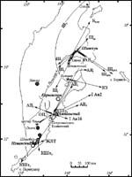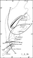 С Авачинским вулканом в голоцене связано не менее семи крупных эксплозивных извержений с объемом пирокластики близким или превышающим 0,5 км3. Большинство из них приурочено к этапу активизации вулкана, когда на поверхность поставлялись продукты андезитового состава [4]. Все крупные извержения этого этапа были плинианскими. Для них были характрены сильные пеплопады, пирокластические волны, а для некоторых извержений также и пирокластические потоки. Для большинства извержений существенна фреатомагматическая составляющая, на что указывает присутствие отложений базисных пирокластических волн, плохая сортированность тефры, часто наличие аккреционных лапилли, сильное обогащение пирокластических отложений резургентным материалом. Высота эруптивных колонн во время извержений колебалась от 16-18 км до 21-28 км [4].Пирокластические потоки имели длину не более 17 км и не достигали местоположения современных населенных пунктов, однако связанные с ними лахары неоднократно пересекали территорию современного г.Елизово и находящегося здесь главного аэропорта Камчатки. Оси пеплопадов были чаще направлены на восток и северо-восток, реже - на северо-запад, в то время как южное подножие, где находятся сейчас гг.Петропавловск-Камчатский и Елизово, было подвержено пеплопадам в минимальной степени (рис.11). Вообще местоположение г.Петропавловск-Камчатский было выбрано крайне удачно: его не достигают пирокластические потоки и пирокластические волны, а возвышенность, на которой расположен город, обтекается лахарами.
