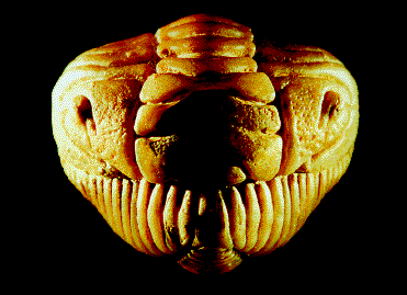 | Свернутый панцирь трилобита Pliomera fischeri (вид спереди). Сворачиваясь, трилобиты защищали мягкое брюшко. Ордовикский период Ленинградской области. Фото А. Бронникова. |