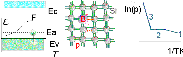 При ионизации акцепторного атома, он захватывает электрон и заряжается отрицательно, при этом в валентной зоне кристалла появляется свободная дырка. При низких температурах большая часть акцепторной примеси не ионизована и уровень Ферми расположен между потолком валентной зоны и акцепторным уровнем. При повышении температуры число электронов, переходящих из валентной зоны на акцепторный уровень возрастает, соответственно возрастает и концентрация дырок(область 1 на правой верхней диаграмме). При этом уровень Ферми приближается к акцепторному уровню (левая диаграмма). При некоторой температуре вся примесь оказывается ионизованной и концентрация дырок (возникших за счет акцепторов), перестает изменяться (область 2 на диаграмме). Это область истощения акцепторной примеси (уровень Ферми в этой области выше акцепторного уровня). При дальнейшем увеличении температуры, наступает момент, когда концентрация носителей заряда, возникающих при возбуждении электронов из валентной зоны в зону проводимости становится больше концентрации акцепторной примеси и зависимость концентрации дырок от температуры принимает такой же вид, что и в собственном полупроводнике (участок 3), при этом уровень Ферми находится вблизи середины запрещенной зоны.