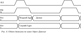 Основу процессорной части прибора составляет микроконтроллер AT89C51 (D1). Шина данных микропроцессора 8и битная, коммутируемая т.е. адрес и данные передаются по одной шине. Для выделения младшего байта адреса используется регистр D2. Программа работы прибора храниться в ПЗУ программ D5. Регистр D2 фиксирует состояние шины адрес-данные по переходу сигнала ALE из высокого в низкий логический уровень. Считывание из ПЗУ слова программы происходит по переходу сигнала PSEN из высокого в низкий логический уровень. Отсутствие конфликтов на шине обеспечивается задержкой сигнала PSEN по отношению к сигналу ALE. Обмен с ОЗУ D6 происходит полностью аналогично, но чтение происходит не по сигналу PSEN, а по сигналу RD. Обмен с ОЗУ и ПЗУ происходит только тогда, когда сигнал А15 находиться в низком уровне. Схематично процесс обмена показан на рис 4.
