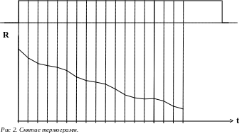 В процессе работы прибора на нагреватель чувствительного элемента подается периодическая последовательность импульсов напряжения. Зависимость напряжения на нагревателе от времени показана на рис 1. После перехода напряжения на нагревателе из низкого уровня в высокий температура сенсора начинает возрастать. Процесс снятия термограмм построен таким образом, что положительный фронт напряжения на нагревателе совпадает с моментом начала съема термограммы. Сопротивление сенсора измеряется через равные промежутки времени. Поскольку процессы прогрева сенсора и снятия термограммы протекают параллельно, то различным значениям температуры сенсора соответствуют различные точки термограммы. При одинаковых внешних условиях такое соответствие является однозначным. В процессе снятия термограммы измеряются падения напряжения на сенсоре, по которым затем определяется сопротивление сенсора R. Схема процесса снятия термограммы показана на рис 2. Проводимость сенсора определяется как R. В выражение (16) входят “парциальные” проводимости отдельных примесей, в то же время, снятие термограмм происходит не отдельно для примесей, а для газовой смеси, содержащей примеси. Исходя из гипотезы о линейной аддитивности сигналов для получения “парциальных” проводимостей необходимо из проводимости среды с примесями вычесть проводимость “чистой” газовой смеси. Таким образом