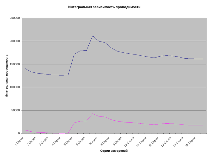 Нижний график представляет собой попытку учесть разнличия между эталонным воздухом и «чистым» воздухом в лаборатории. ( Из верхнего графика вычтена «фоновя» проводимость, обусловленная воздухом в лаборатории. В качестве «чистого» воздуха взят результат измерений, наименее отличающийся от эталонного.)