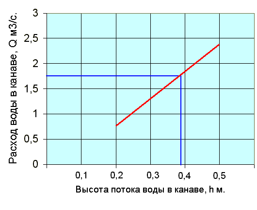 Из графика видно, что при данном расходе воды 1,75 м3/с высота потока воды в канаве буде равна 0,39 м.
